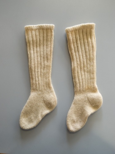 realizzati ai ferri con lana di colore bianco: il gambale è lavorato a costine, il piede a maglia rasata, il bordo superiore è a costine e all'interno vi è stato inserito un elastico.