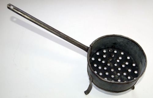 recipiente in ferro a sezione circolare. Dotato di lungo manico concavo, con estremità forata per appenderlo alla parete; lestremità opposta è fissata al recipiente con due borchie di rame. Il recipiente è dotato di tre piedini di ferro a sezione rettangolare, leggermente arcuati all'estremità inferiore e fissati con due borchie alla parete della padella. Il fondo del contenitore è bucherellato con una serie di fori rotondi.