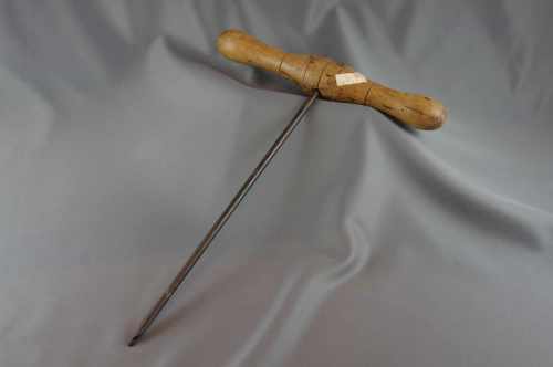 Trivella con asta a sezione circolare, punta ad elica, dotata all'estremità di un piccolo cono filettato che aiuta l'operatore a posizionare la punta stessa nel punto desiderato. L'impugnatura è stata tornita con una certa pretesa estetica.