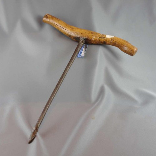 Trivella con asta a sezione quadrangolare e punta elicoidale. L'impugnatura è costituita da un semplice ramo non rifinito nel quale si infila l'asta dello strumento.