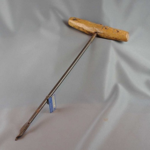Trivella con asta a sezione circolare e punta elicoidale. L'impugnatura è costituita da un corto pezzo di legno sagomato, nel quale si infila l'asta dello strumento.