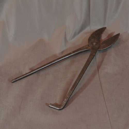 Robuste cesoie di grandi dimensioni: uno dei gambi, incernierati fra loro, termina con una piegatura ad angolo retto che, toccando l'altro gambo, impedisce di stringere troppo l'arnese. I bordi esterni delle lame sono arcuati, mentre i fili sono rettilinei e leggeremente usurati.