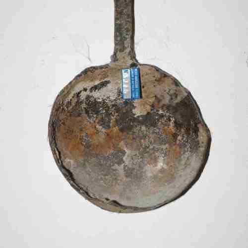 Il mestolo, semisferico, è fissato manico a sezione rettangolare, terminante con un ricciolo, nel quale è infilato un anello.