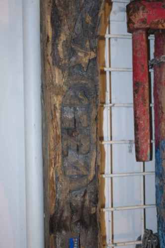 Parte centrale della #sòja dé pòpe# di un trabaccolo. Annerita dal tempo, presenta quasi tutta la parte interna scolpita a bassorilievo. Al centro, come all'interno di un cartiglio, si legge la data 1921. Quindi, sotto due stelle a cinque punte poste simmetricamente ai lati del cartiglio, si dipartono in rilievo due linee curve che sembrano formare una doppia onda, prima di arrestarsi alla base di un corto segmento verticale. La venatura del legno, che segue la curvatura del pezzo, indica che la ghirlanda è stata ricavata da un albero già curvo per natura o per intervento umano. Conserva ancora quattro chiodi e due fori per gli stessi.