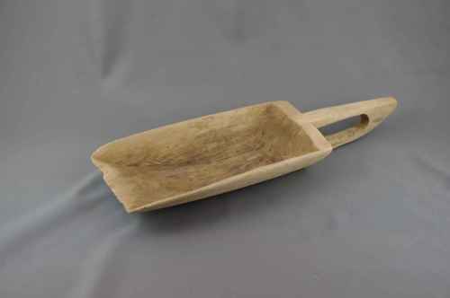 Sessola di legno intagliato, di forma rettangolare dotata di impugnatura chiusa.