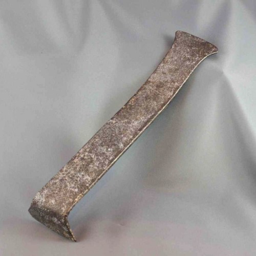Raschiatoio ricavato da una barra di ferro nastriforme: le estremità (una delle quali è piegata ad angolo retto), che terminano con una lama curvilinea convessa, risultano allargate rispetto al corpo dell'oggetto stesso.