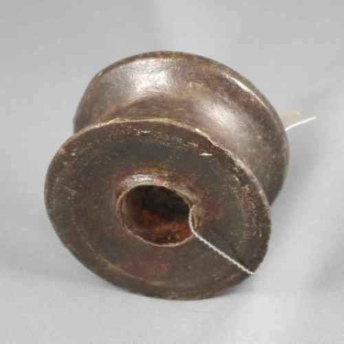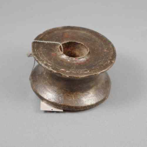 Robusta puleggia in ghisa, dotata di foro passante e di un'ampia scanalatura per lo scorrimento della corda.