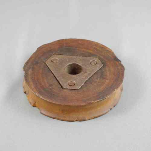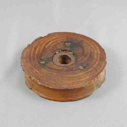 Puleggia in legno tornito nella quale è inserita una parte in ottone a sezione grossomodo triangolare, che ospita il foro passante che permette al #rajo# l'inserimento all'interno del bozzello.