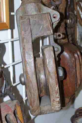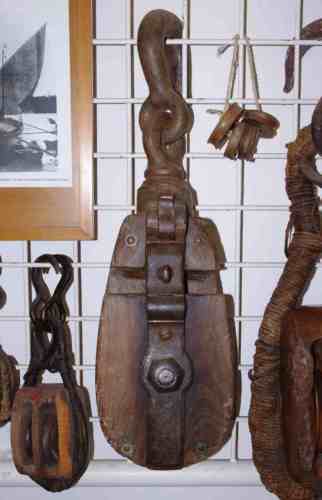 Si tratta di un bozzello di grandi dimensioni, caratterizzato dal gancio girevole e da una guancia incernierata ed apribile che permette di inserire il cavo senza doverlo infilare nella puleggia per un'estremità. La parte in legno è stata costruita unendo con robusti chiodi tre parti o settori in legno. Si tratta di un tipo di lavorazione più moderna rispetto a quella che prevedeva l'intaglio del bozzello da un unico pezzo di legno.