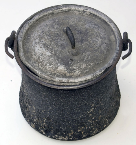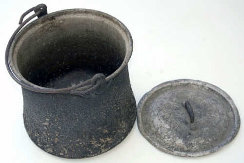 recipiente in ferro con fondo tondeggiante leggermente più largo della bocca e bordo superiore ripiegato; completo di manico in ferro ad arco le cui estremità sono inserite entro placchette sagomate con occhielli forati, fissate con borchie sotto il bordo della pentola. Oggetto completamente coperto di caliggine sulla superficie esterna. Pentola completa di coperchio in alluminio di forma circolare con bordo rialzato e arrotondato; dotato di manico in ferro di forma rettangolare fissato al centro della calotta con borchie.