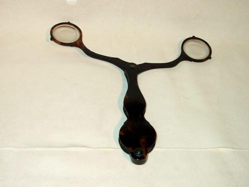 Fassamano (occhiale a forbice) in tartaruga. L'astuccio-impugnatura è a forma di otto allungato e funge anche da protezione quando l'occhiale non viene usato. [Descrizione estratta dal database del Museo dell'Occhiale.]