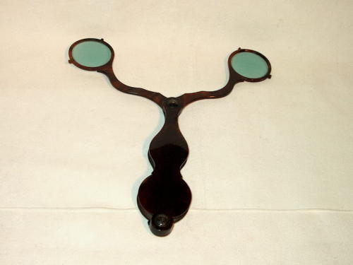 Fassamano (occhiale a forbice) in tartaruga. L'astuccio-impugnatura è a forma di otto allungato e funge anche da protezione quando l'occhiale non viene usato. Lenti rotonde colorate in verdino. [Descrizione estratta dal database del Museo dell'Occhiale.]