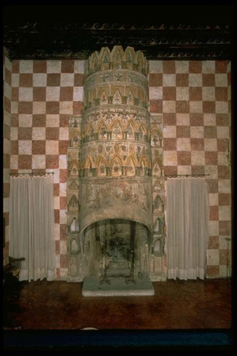 - NOTIZIE STORICO CRITICHE Tutte le fonti legano la storia del camino alla presenza dei da Carrara a Monselice (dal 1337 fino alla conquista scaligera, nel 1388). All'origine doveva presentarsi come il camino della seconda stanza dell'attuale armeria: decorato con gli scacchi rossi e bianchi. Le ultime due fasce sono dovute all'intervento della famiglia Marcello, la quale fece riprendere il modulo della nicchia gotica, sostituendo, per, le colonnette in maiolica con altre in legno. I Marcello provvidero anche a rinnovare la decorazione pittorica della cappa e delle ali esterne, prevalentemente con motivi a grottesca, diffusi in area veneta, negli anni a seguire la met del Cinquecento soprattutto da pittori veronesi (ad es. Gian Battista Zelotti, Eliodoro Forbicini). Utile, per le più approfondite informazioni, A. Callegari, che vide - e fotografò - il camino prima dell'intervento di Cini (A. Callegari 1913-24).