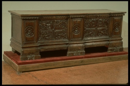 - NOTIZIE STORICO CRITICHE provenienza antiquariale. Nei Musei Civici di Padova è conservata una porta (inv. 483), proveniente da Monteortone (PD), le cui specchiature presentano una certa vicinanza, nella tecnica e nella resa del motivo decorativo floreale, con le due specchiature frontali del cassone.