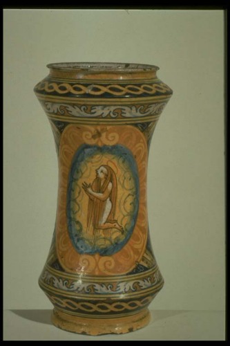 motivi decorativi: motivo decorativo a panoplia, con testa d'aquila, sul retro, motivo decorativo a catenella, motivo decorativo a foglie. Personaggi: Maddalena penitente.