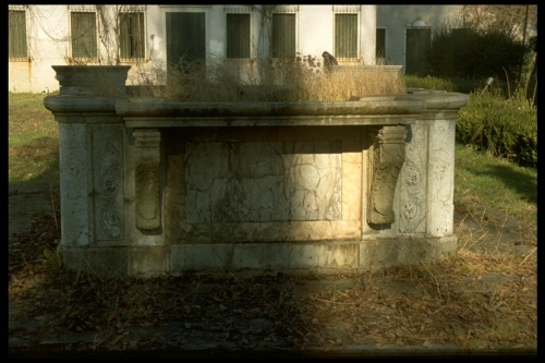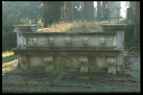 Vasca rettangolare con fronte decorato da testine di cherubini, alternate a scudi a testa di cavallo; la bocca dei cherubini è dotata di beccuccio per lo zampillo dell'acqua che scola poi in una vasca sottostante.