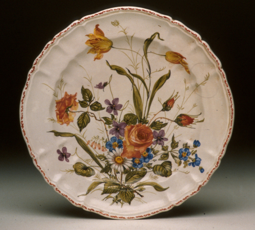 piatto di grandi dimensioni con cavetto appena accennato e tesa ondulata; decoro policromo