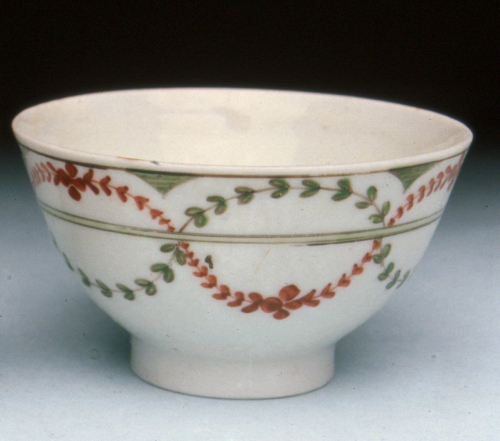 tazzina a coppetta senza manico su base ad anello; decoro policromo
