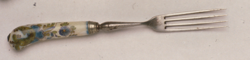forchetta con manico in maiolica caratterizzato da un decoro policormo