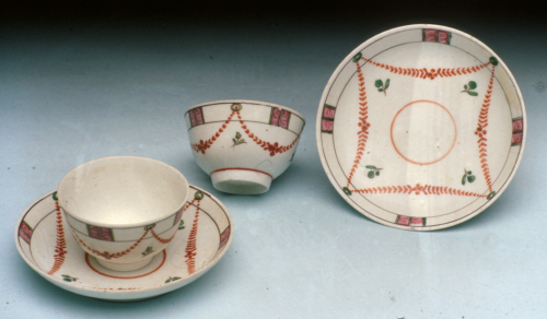 tazzina a coppetta su base ad anello, senza manico; piattino con orlo leggermente rialzato; decoro policromo