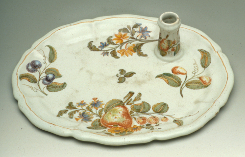 vassoio ovale con tesa a coste e orlo mistilineo, calamaio cilindrico; decoro policromo