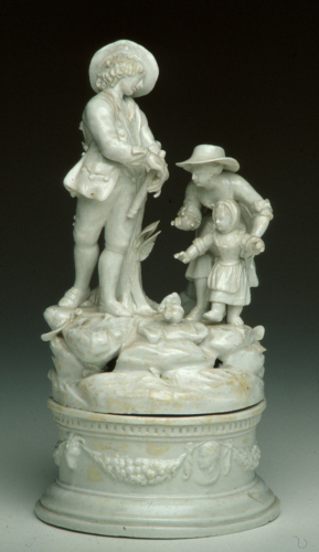 gruppo figurato, bianco, su base cilindrica decorata a festoni in rilievo, costituito da un giovane, una giovinetta e un bambino