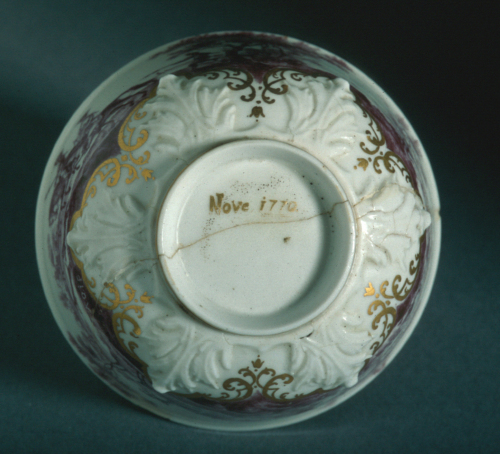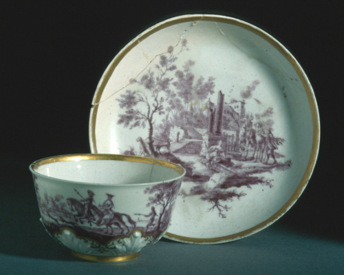 tazzina a coppetta su base ad anello profilato in oro e ornato da valve di conchiglia rovesciata; piattino con orlo rialzato; decorazione in monocromia marrone-violetto e profilature in oro