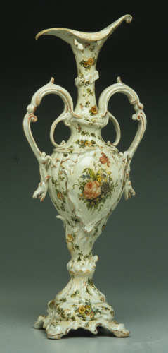 vaso con anse draghiformi, ventre tondeggiante, alto collo e piede a piedistallo; decoro policromo