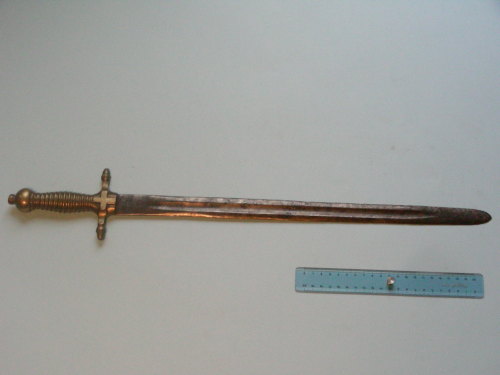 lama dritta a doppio filo con sguscio centrale su entrambi i lati. Fornimento in unico pezzo con l'impugnatura. Guardia a croce con rami terminanti con ghiande. Impugnatura con scanalature di presa e pomo. Bottone che trattiene il codolo, ribattuto.