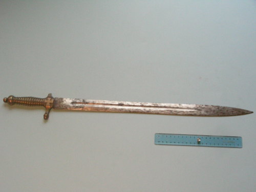 lama dritta a doppio filo con sguscio centrale su entrambi i lati. Fornimento in unico pezzo con l'impugnatura. Guardia a croce con rami terminanti con ghiande. Impugnatura con scanalature di presa e pomo.