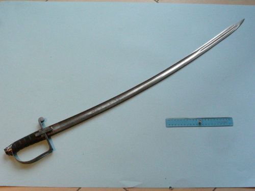 probabilmente civile; lama curva, a filo, punta e controfilo. Ampie sgusciature sui due lati, per i primi tre quarti; per l'ultimo quarto, due sgusci al centro per la lunghezza del controfilo. Punta ribassata alla pandura. Fregi al cesello a motivi militari e floreali su entrambi i lati della lama per la prima metà. Guardia a staffa ad un solo ramo; ramo di parata a riccio con spacco per dragona; alette fermafodero rettangolari; cappetta lunga con dorso sfaccettato. Bottone ottagonale avvitato al codolo; alcune varianti nel bottone e nel fissaggio della cappetta alla guardia, diversi dalla classica modello 1855. Impugnatura a settori zigrinati separati da cinque scanalature.