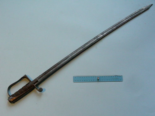 lama curva, a filo, punta e controfilo. Ampie sgusciature sui due lati fin quasi alla punta, ribassata alla pandura. Fregi ad acido a motivi militari e floreali su entrambi i lati della lama per la prima metà. Fregio floreale anche sul dorso. Guardia a staffa ad un solo ramo; ramo di parata a riccio con spacco per dragona; alette fermafodero rettangolari; cappetta lunga con dorso sfaccettato. Tipico bottone ottagonale avvitato al codolo. Impugnatura a settori zigrinati separati da quattro scanalature.