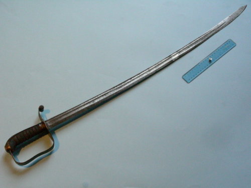 Lama curva; sguscio centrale per tre quarti della lama, scanalatura vicino al dorso. Punta originariamente al dorso, ribassata in una successiva modifica. Guardia piena ad un solo elso, stretta; elso di parata a ricciolo scanalato, integrato con la guardia. Cappetta stondata liscia. Codolo ribattuto su rondella. Impugnatura rivestita, sagomata a settori, zigrinata a buccia d'arancia a imitare la pelle di pesce. Rivestimento al tallone.