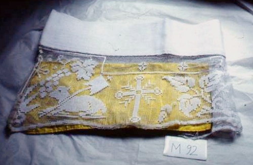 Bordura con filetcon disegni floreali ed eucaristici (croce, agnello, JHS, foglie di vite). Ricamo sulla tela con filo di cotone rosso "AM".