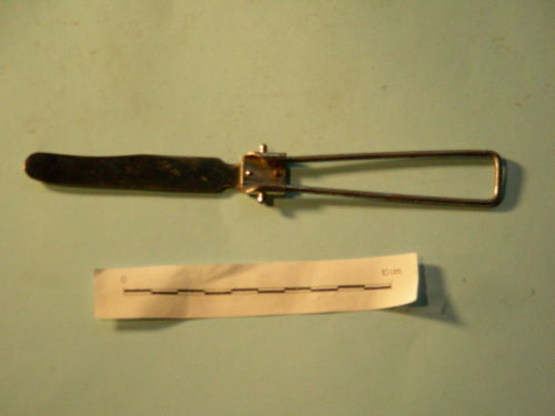 Con impugnatura vuota, pieghevole, con meccanismo di fissaggio. Punta stondata, filo unico.
