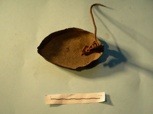 Piatto a forma di foglia, con bordo rialzato. Gancio di sostegno fissato a braccio ricurvo a sua volta fissato al piatto mediante tre rivetti.