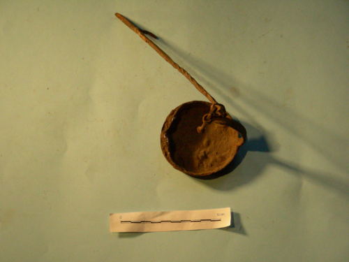 Piatto circolare, con bordo rialzato. Gancio di sostegno con gambo a torciglione e punta ad arpione collegato mediante snodo al braccio ricurvo del piatto.