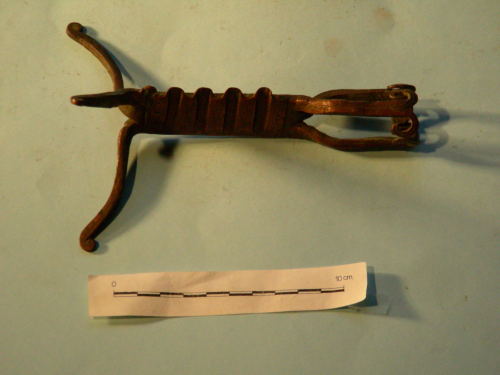 A tre piedi terminanti a ricciolo, e tre sostegni della candela terminanti a doppio ricciolo. Decorato ad incisione a motivi floreali.