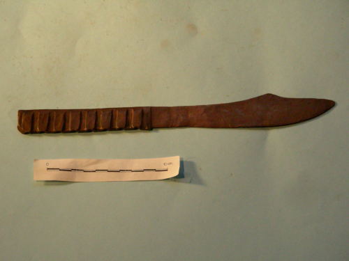 Lama curva, a forma di scimitarra, con doppia punta arrotondata e filo unico.