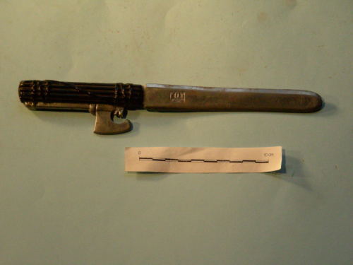 Lama dritta, a doppio filo, con punta arrotondata. Impugnatura verniciata in nero lucido a decorazione tridimensionale a forma di fascio littorio.