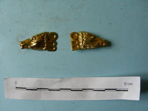 A forma di testa di lupa, uno verso destra, uno verso sinistra; con gancetto sul retro.