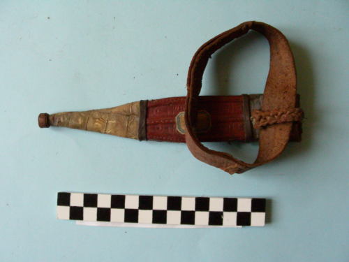 in cuoio, rivestito in pelle naturale (marocchino) rossa, decorata su entrambe le facce da incisioni geometriche; sulla faccia principale tre costolature in rilievo. Puntale e cappa in pelle di rettile, bianca. Fascia di fissaggio al braccio in pelle morbida.