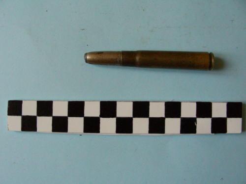 Di forma cilindrica, con fondello e restringimento all'apice del bossolo e proiettile conico con soft point.