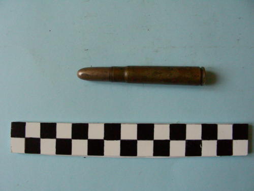 Di forma cilindrica, con fondello e restringimento all'apice del bossolo e proiettile conico.