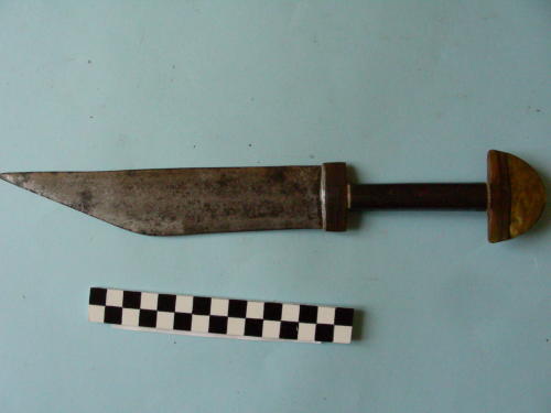 lama larga, piatta, asimetrica, a doppio filo, dritta per due terzi, punta ricurva per il terzo rimanente. Impugnatura in più pezzi, terminante con una cuspide (tipico puntale a mezzaluna).
