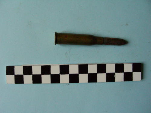 Bossolo di forma cilindrica, con fondello e restringimento all'apice; proiettile conico con punta arrotondata.
