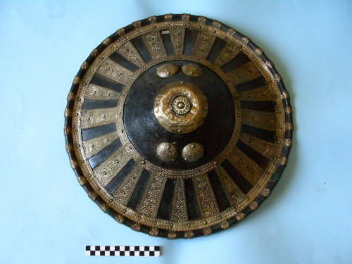 calotta in lamiera di ferro sagomata per stampaggio a pressa. Il bordo è stato ripiegato verso linterno a formare un cordoncino a sezione circolare. Il rivestimento esterno è in stoffa pesante, trattata con vernici a simulare la pelle conciata. Gli elementi decorativi sono in lamina dottone decorata a sbalzo, per pressatura su matrice; sono fissati alla calotta su un substrato di pece e con rivetti in ottone a testa tonda e due codoli ribattuti allinterno. Manca completamente il rivestimento a copertura dell interno, originariamente in stoffa o in sottile pelle conciata (marocchino). Impugnatura in legno flessibile, rivestita in pelle, quasi completamente mancante; è fissata alla calotta con strisce di lamiera di ferro, a sua volta fissate alla calotta con rivetti di ferro. E presente una cinghia in cuoio per sospendere lo scudo alla sella. Decorazioni: ha un bottone centrale, in fusione dottone, a forma di fiore, seguito da una calottina di ottone con incisioni a volute intrecciate. Quattro coppelle in ottone decorato coprono i punti di fissaggio dellimpugantura interna. Più sotto, una striscia di lamierino a sbalzo rullato, divisa in cinque segmenti disposti a cerchio, fissa la parte superiore di venti piastre in lamierino dottone, decorate a sbalzo per compressione su matrice. La parte inferiore dei venti elementi decorativi è fissata alla calotta con una striscia di lamierino di ottone divisa in dieci segmenti, identica a quella del fissaggio superiore, sia nelle dimensioni che nel disegno decorativo. Il bordo circolare è decorato con quaranta strisce trasversali in lamierino dottone (una mancante), decorate per rullatura su matrice.