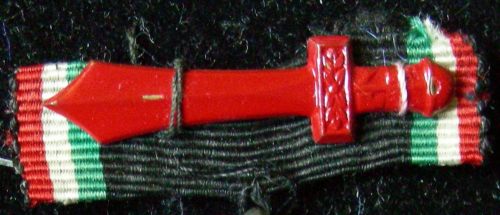 costituito da nastro nero con i colori della bandiera italiana su entrambi i lati, sopra il quale è cucito un piccolo gladio metallico verniciato in rosso, con la guardia decorata da foglie d'alloro.