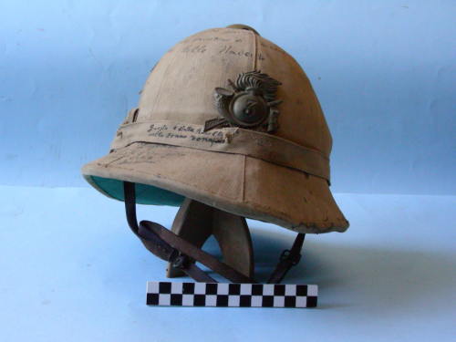 - ISCRIZIONI a spirale sulla calotta, sulla fascetta e sulla tesa - Grorioso III Regimento Bersglieri acui io partengo e con molo orgolio il mio comante che mi partiene un pesetino di medalia d'oro con qistatta nel amba Radan il 15 Agosto 1935 Bers. Bello Umberto. Questa e statta Racolta nella zonna zona? Caffa laparte oposta del Lagotana Penisola di Gorgora chiamata Iveta Musolini - Bello Umberto - corsivi - a penna -