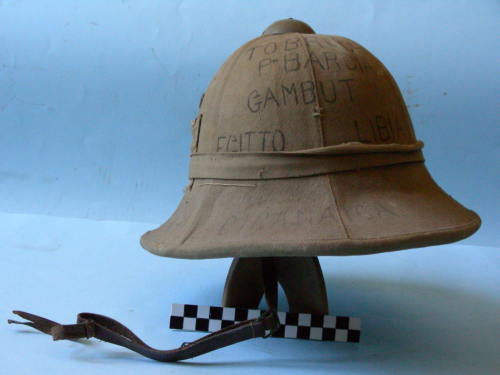 Calotta a sei sezioni sormontata da calottino in lamiera con tre fori di aerazione; tesa larga; due fori di aerazione laterale. Fascia posta sopra la tesa, fissata tramite un passante. Taschino in posizione laterale. Rivestimento interno color verde. Sottogola a cinturino regolabile, fissato con gancetti metallici all'interno.
